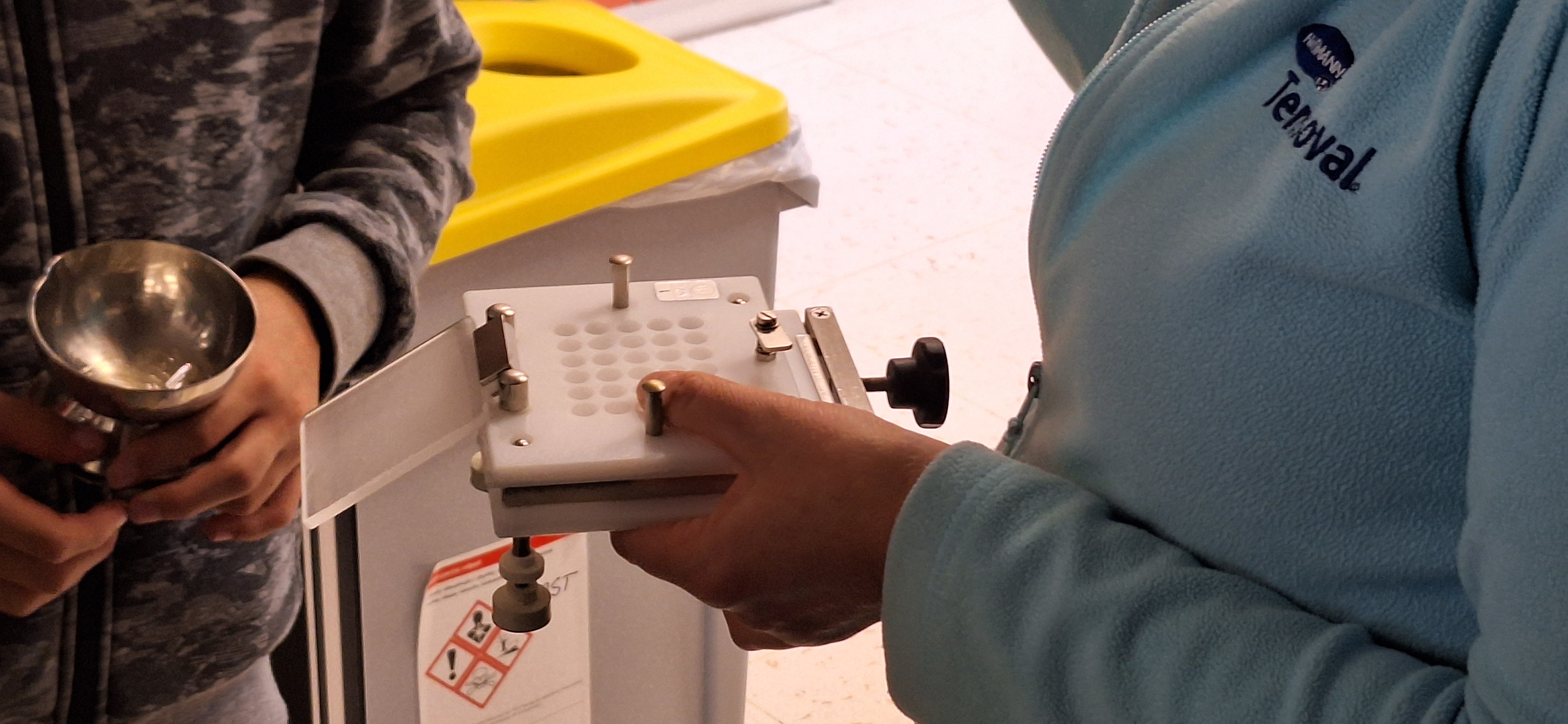 Vedoucí lékárny Vlasta Spurná ukazuje žákům laboratoř, ve které sedí dvě farmaceutky: „V lékárně totiž nejen léky vydáváme, ale některé i sami vyrábíme. Jsou to třeba různé masti, nebo léky v tobolkách. Máme na to vybavení včetně velmi přesných lékárnických vah,“ řekla a názorně ukázala, jak v malém speciálním přístroji léky ve formě kapslí dělají. Každý školák si mohl jednu prázdnou želatinovou tobolku vzít.