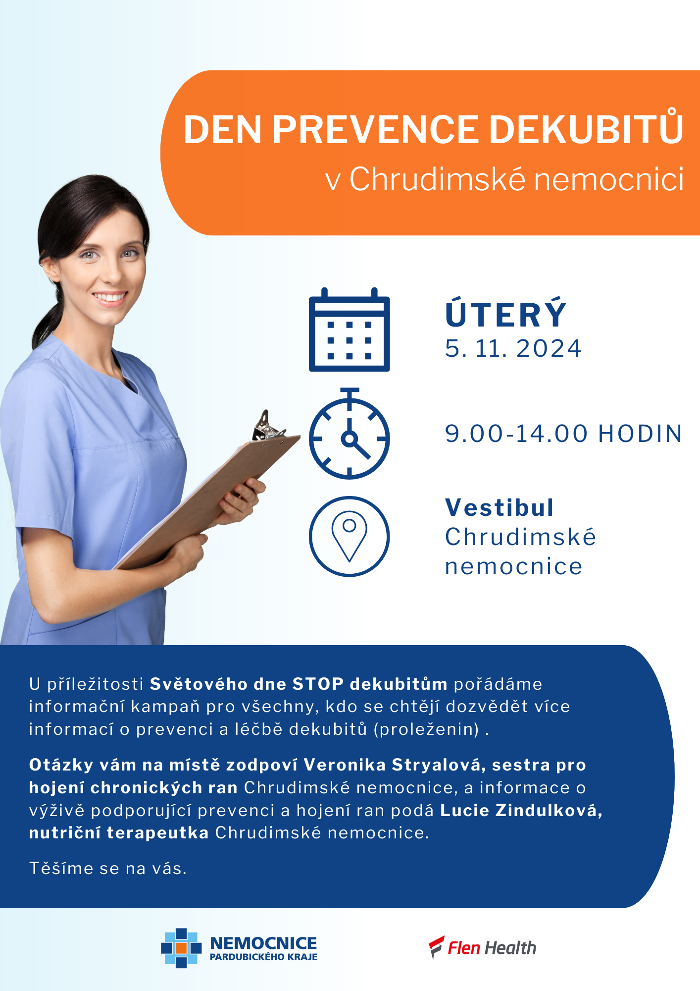 Návštěvníkům akce zodpoví na místě dotazy Veronika Stryalová, sestra pro hojení chronických ran Chrudimské nemocnice. Informace o výživě podporující prevenci a hojení ran podá zájemcům Lucie Zindulková, nutriční terapeutka Chrudimské nemocnice.